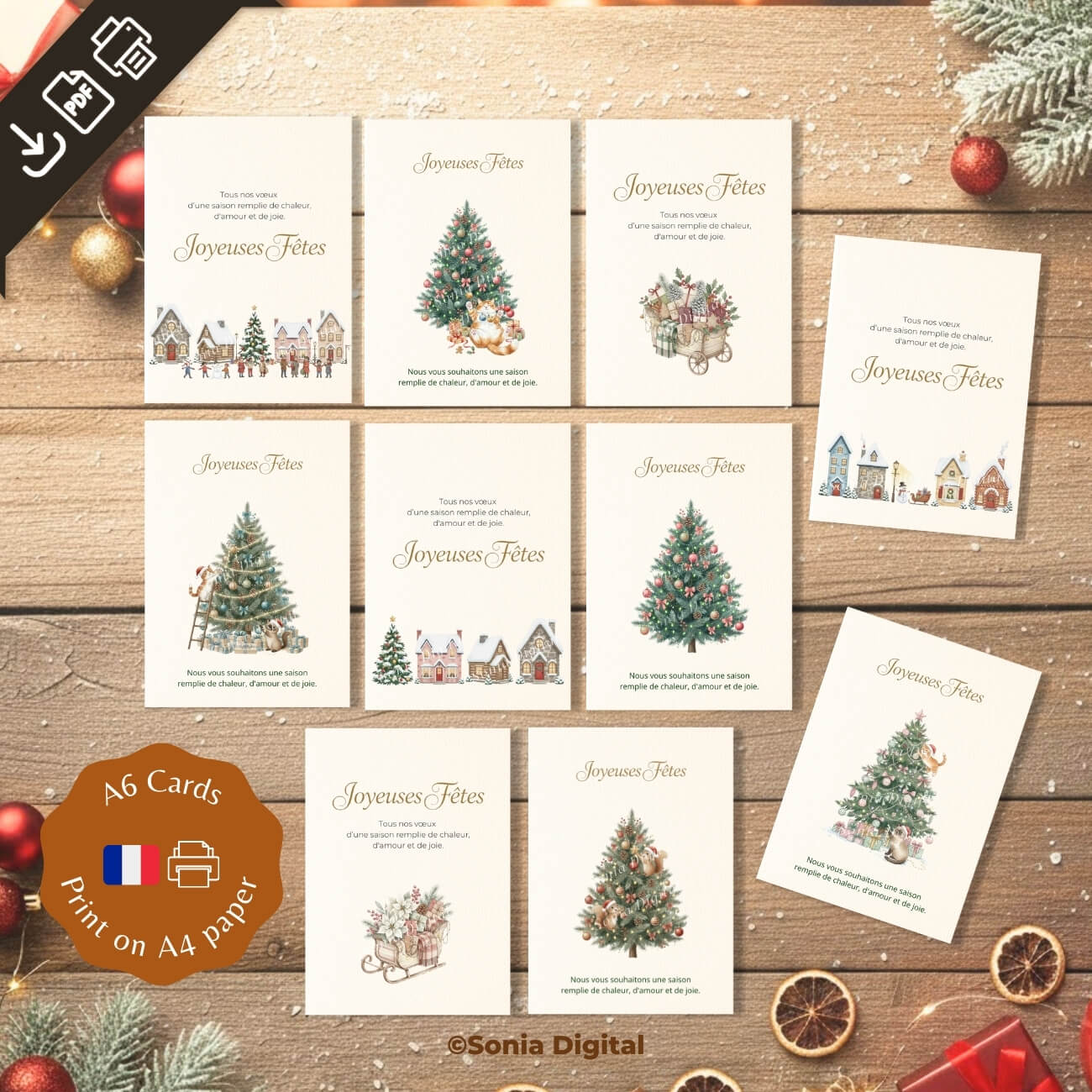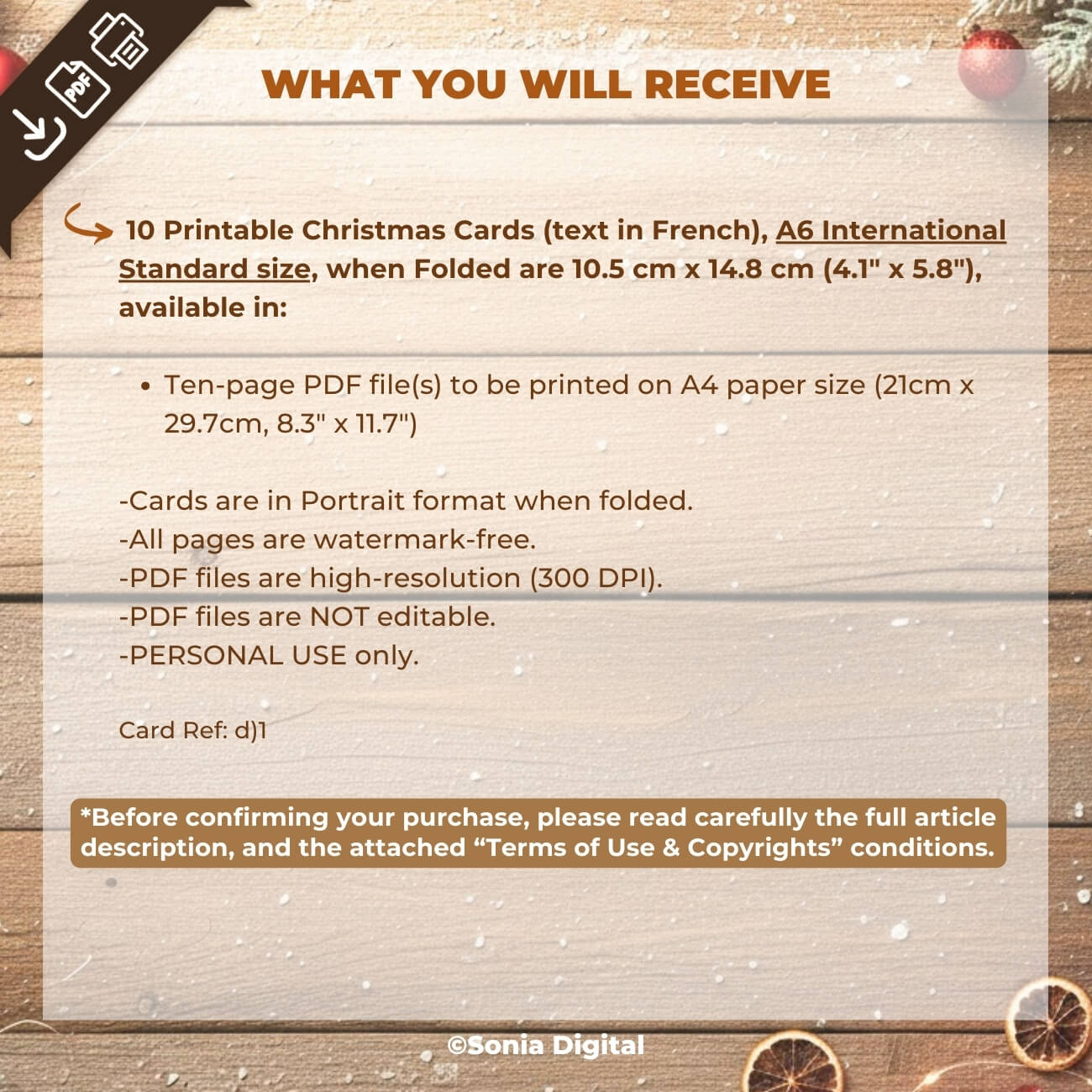 This digital bundle includes 10 beautiful printable Christmas card designs featuring “Joyeuses Fêtes.” Each card is sized at A6 (10.5 cm x 14.8 cm when folded) and is designed for easy printing on A4 paper. All cards within this set feature text written exclusively in the French language.
