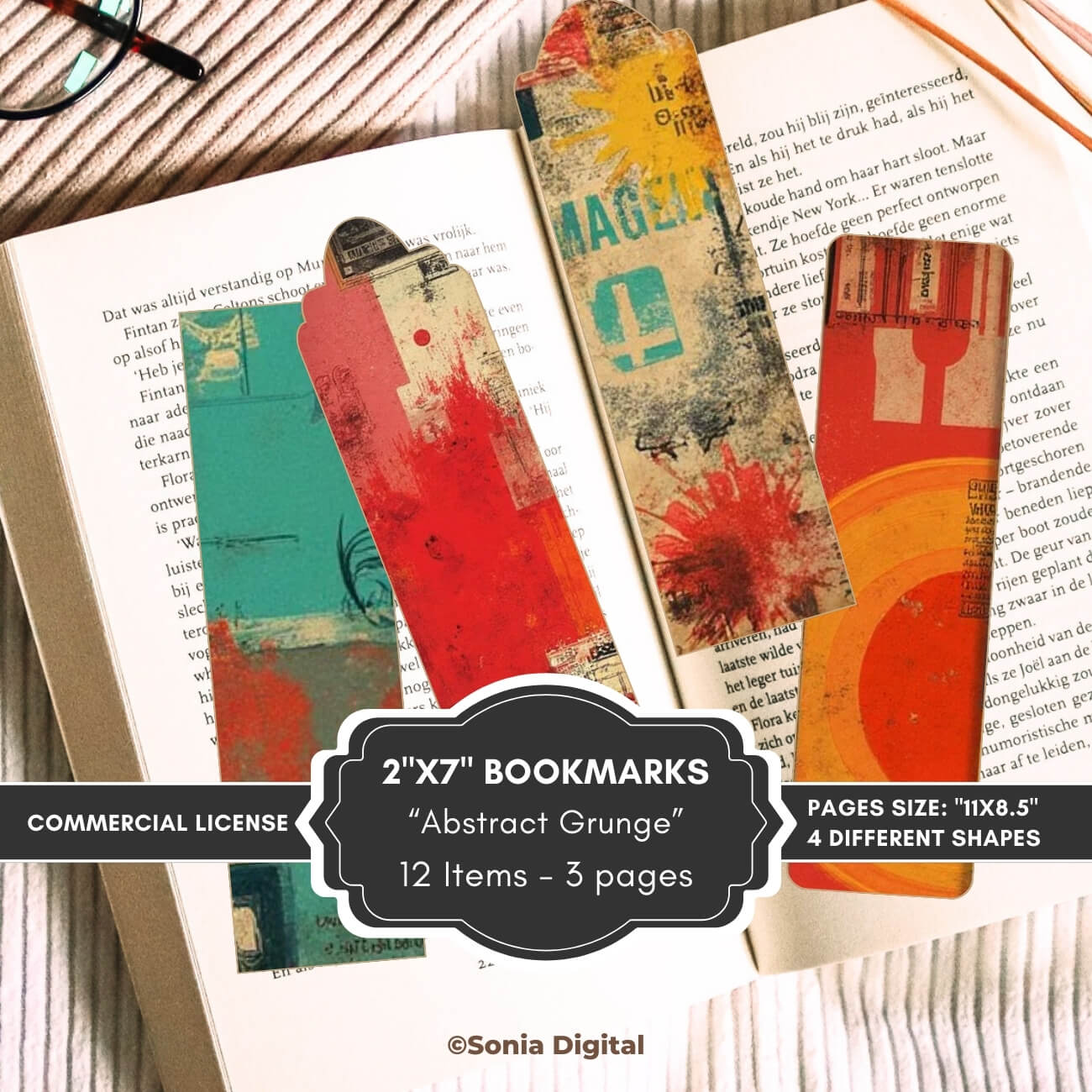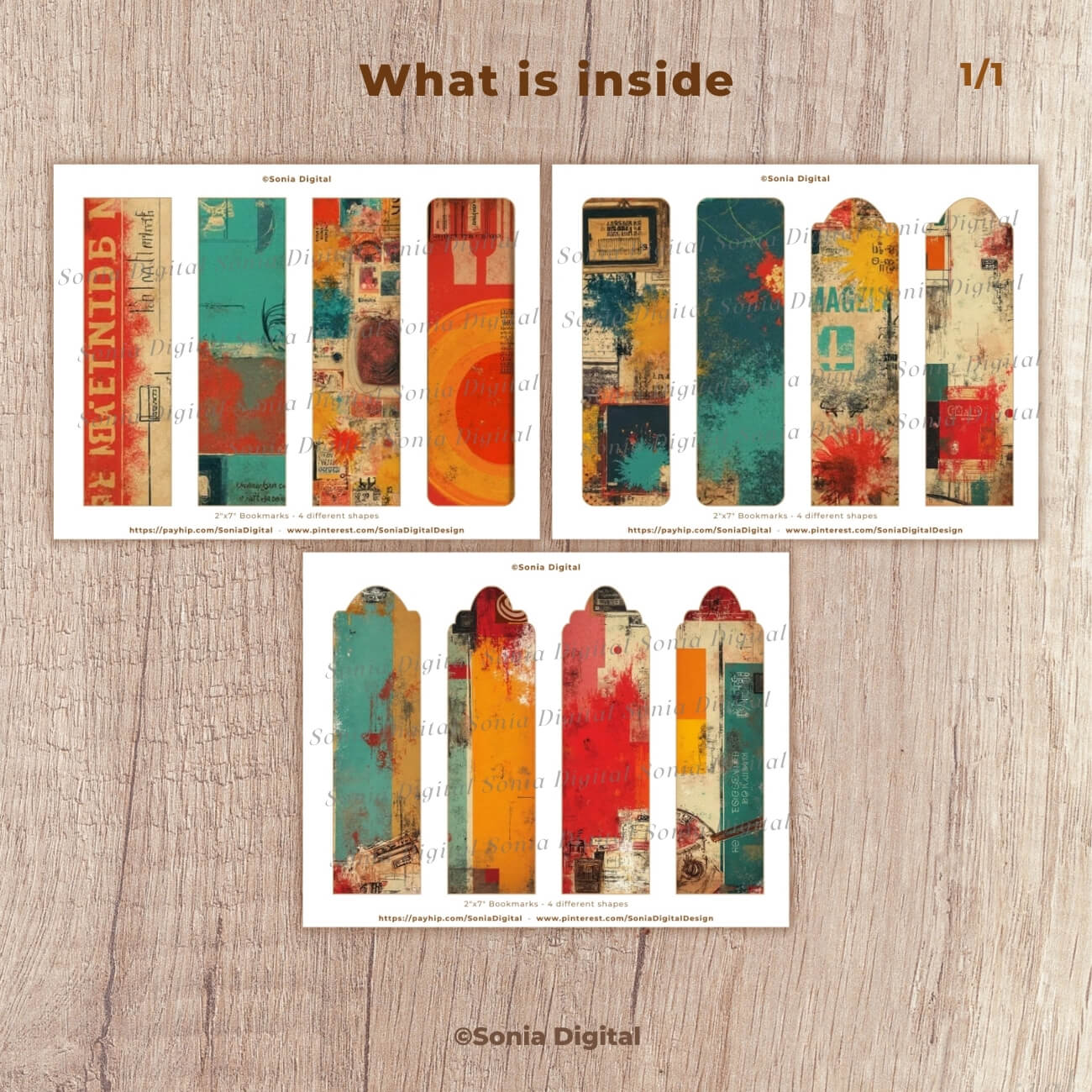 🔸3 printable pages with 12 2”x7” Bookmarks, “Abstract Grunge” Collection. In Letter size, 11”x8.5”. All pages are sold watermark-free. 3 bookmarks x 4 different shapes included in this kit, for a total of 12 bookmarks in your 3-page purchase.