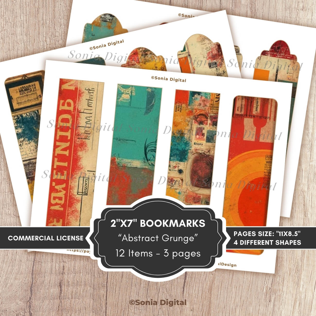 3 printable pages with 12 2”x7” Bookmarks, “Abstract Grunge” Collection. Pages are Letter sized (11”x8.5”). Commercial use license included*.