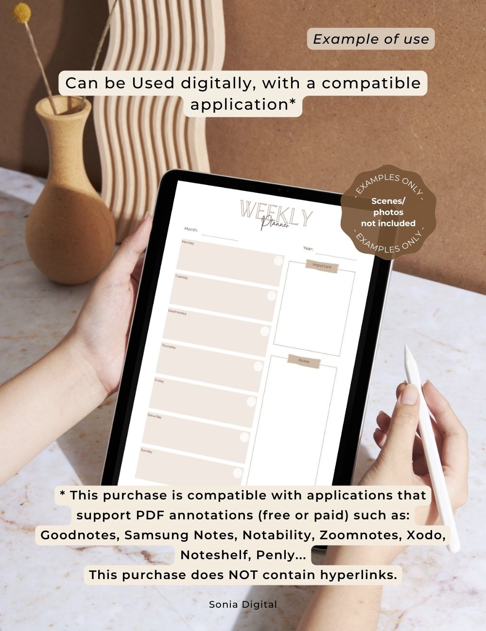 * Digital use: Compatible with note-taking and planning applications that support PDF annotation files such as: Goodnotes, Samsung Notes, Notability, Zoomnotes, Xodo, Noteshelf, Penly, etc.