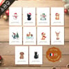 This digital set includes 10 printable Christmas card designs, featuring a variety of adorable and funny characters and animals in festive attire (on a white background). Each card includes a French holiday greeting such as "Joyeux Noël," "Joyeuses Fêtes," or "Bonne Année."