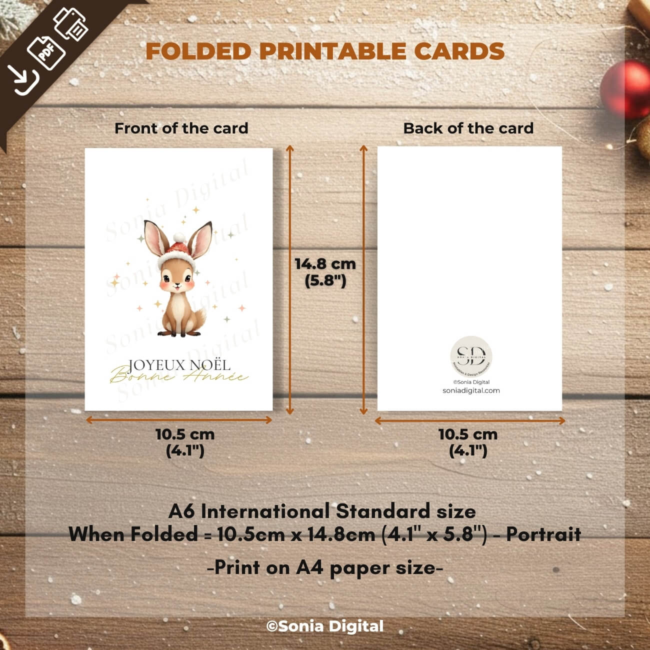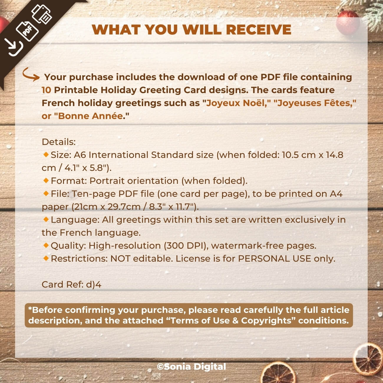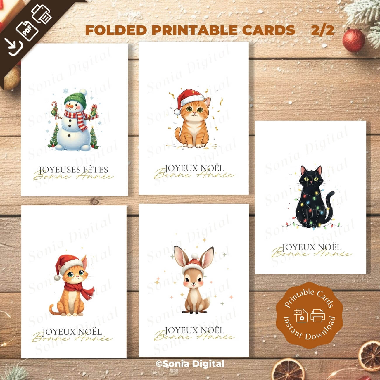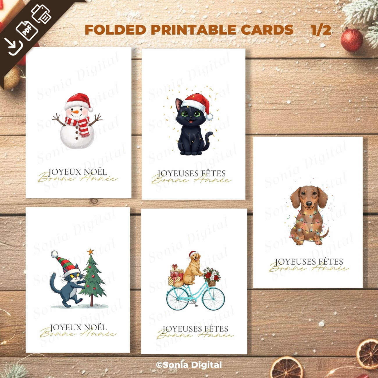 Your purchase includes the download of one PDF file containing 10 Printable Holiday Greeting Card designs. The cards feature French holiday greetings such as "Joyeux Noël," "Joyeuses Fêtes," or "Bonne Année."
