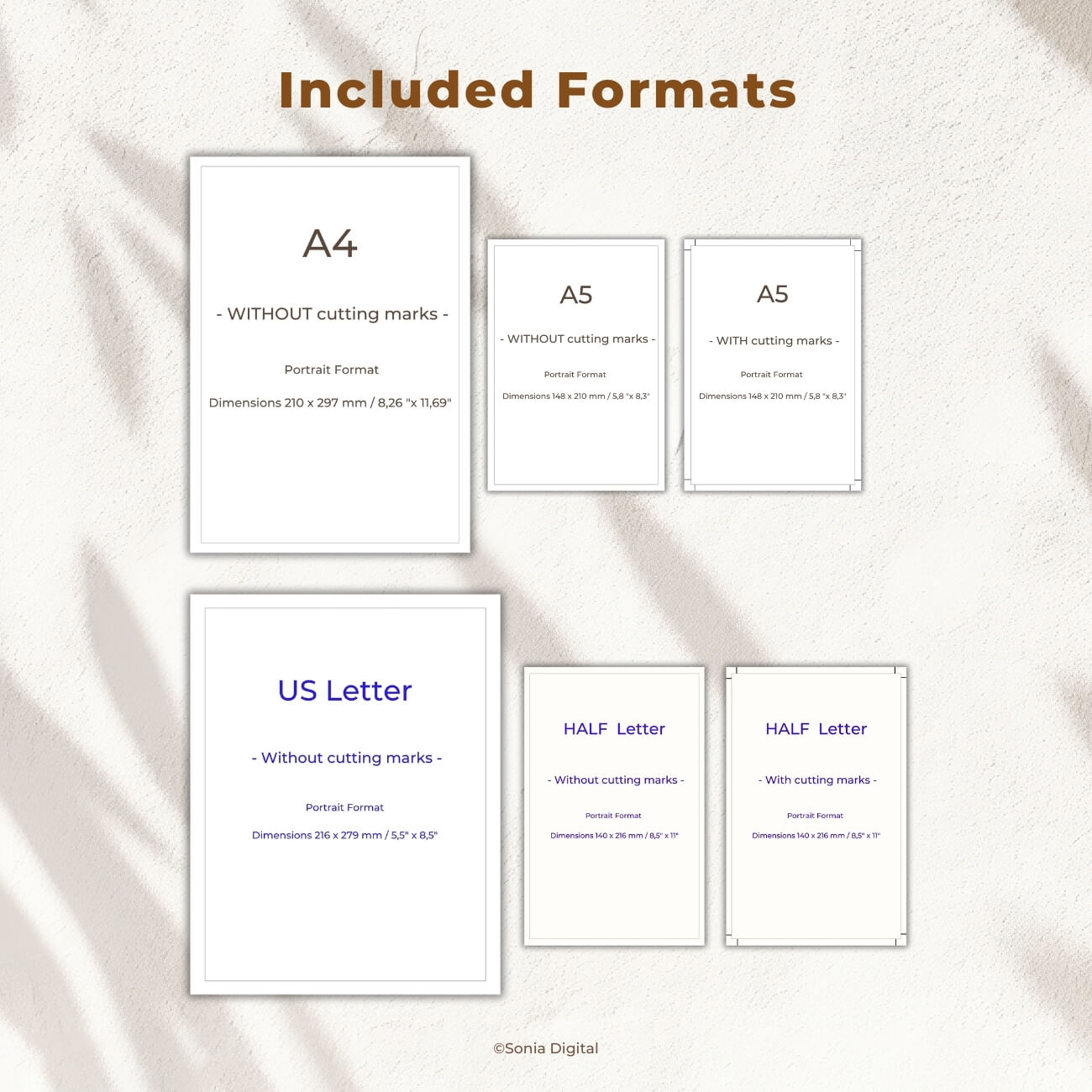 (A4 = 210 x 297 mm / 8.26’ x 11.69’ ▪️ A5 = 148 x 210 mm / 5.8’ x 8.3’ ▪️ Letter = 216 mm x 279 mm / 8.5’ x 11.0’ ▪️ Half Letter = 140 x 216 mm / 5.5’ x 8.5’)
