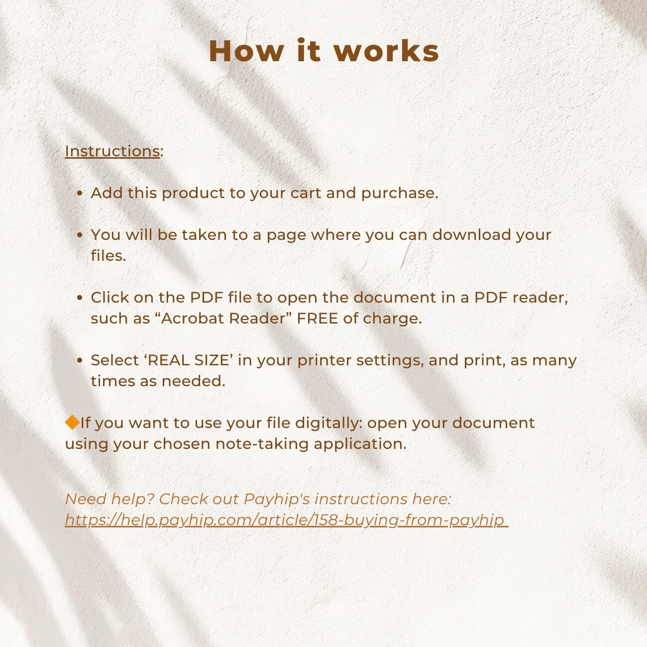 🔶 Note that your purchase contains files mainly intended for print use. The digital version contains NO HYPERTEXT LINKS, unlike digital files designed specifically for digital use (planners, notebooks, etc).