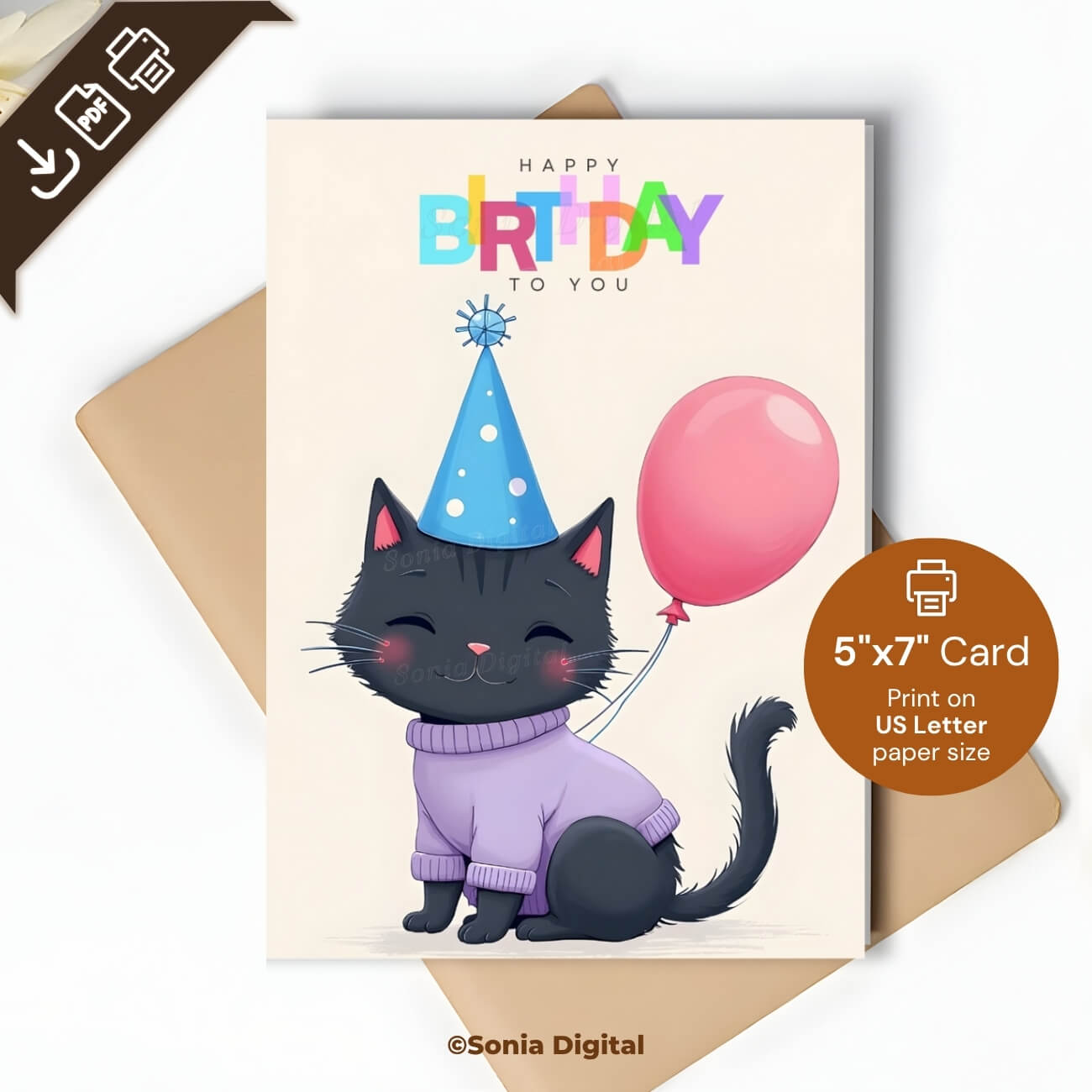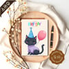 Printable Birthday Card “Happy Birthday to you”, 5”x7” (12.7cm x 17.8cm) when folded, featuring a black kitten. Available in: