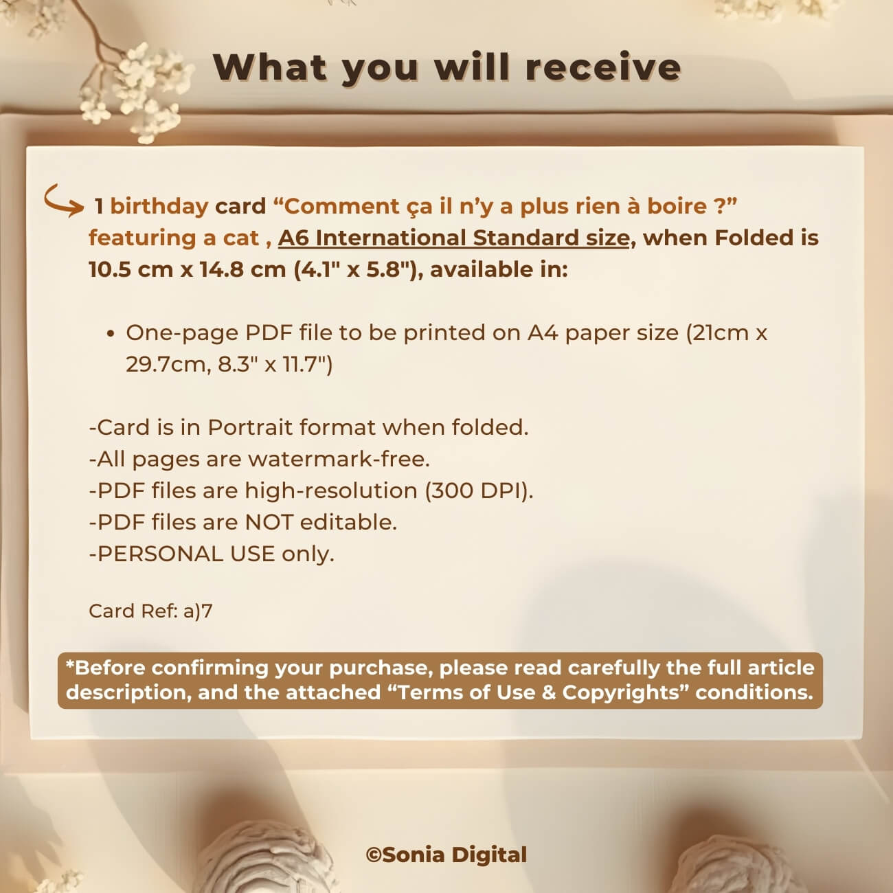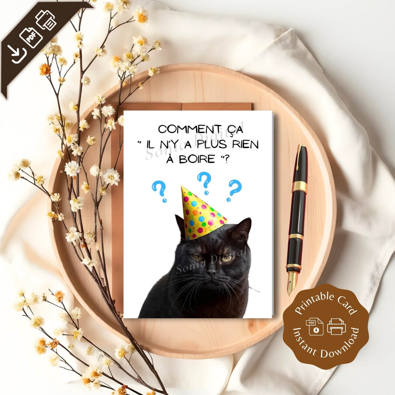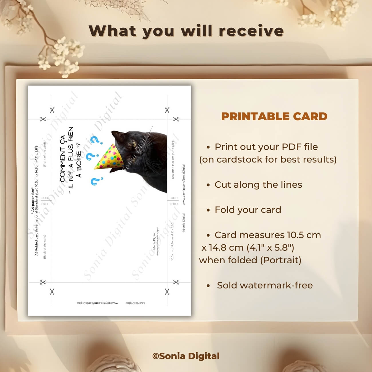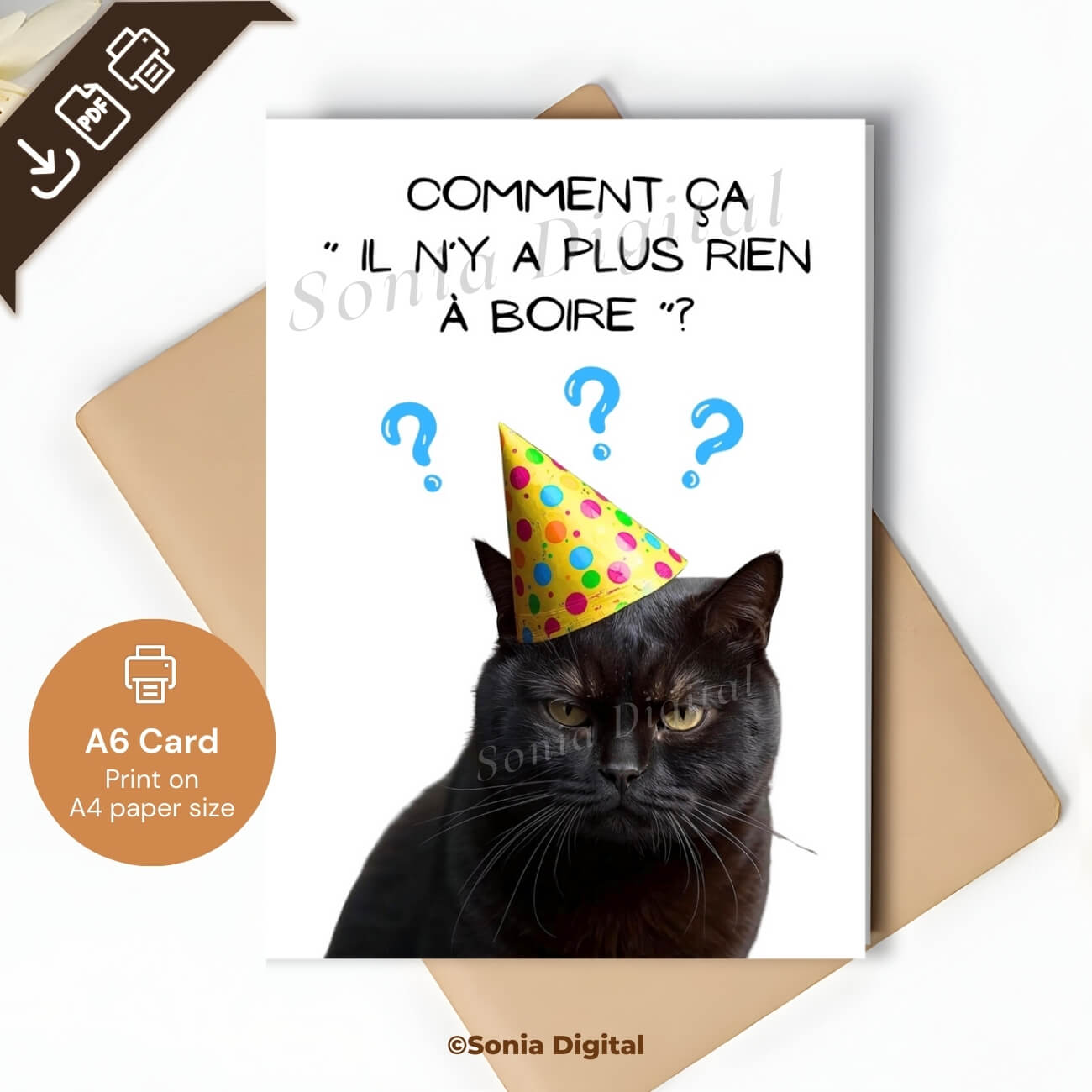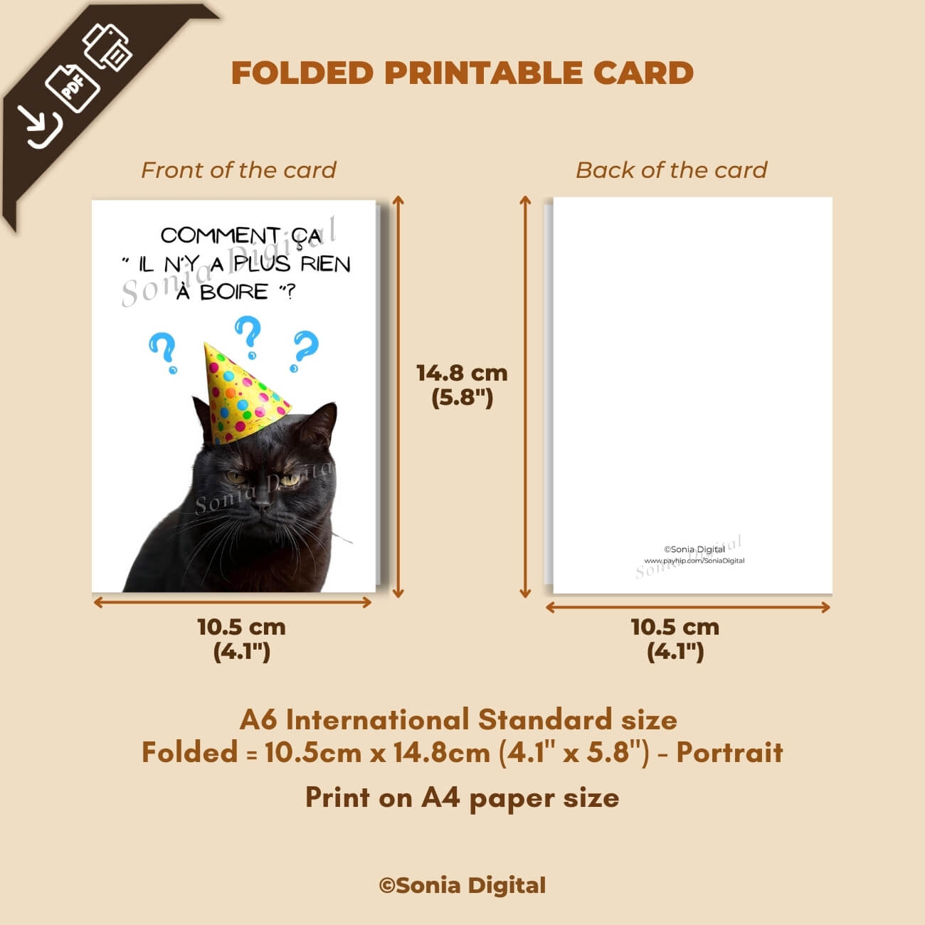 1 Printable Birthday Card “Comment ça il n’y a plus rien à boire?” Cat, A6 International Standard size - when Folded is 10.5 cm x 14.8 cm/ 4.1" x 5.8"). Available in: