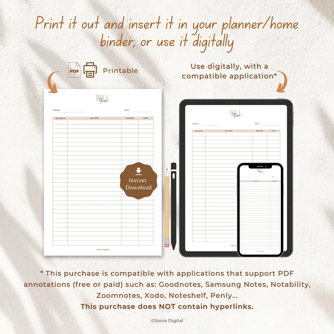 * Digital use: Compatible with note-taking and planning applications that support PDF annotation files free or paid) such as: Goodnotes, Samsung Notes, Notability, Zoomnotes, Xodo, Noteshelf, Penly, etc.