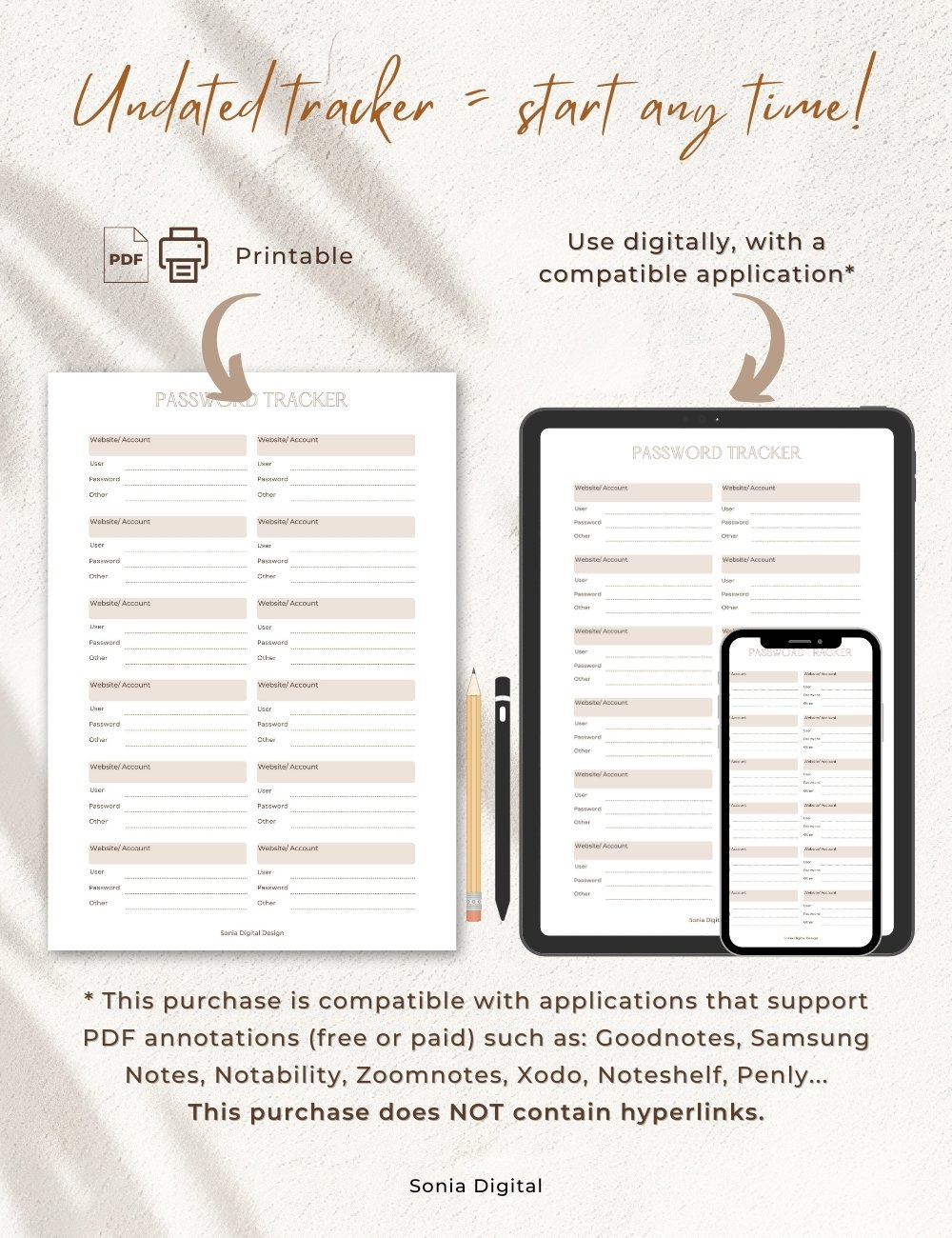 * Digital use: Compatible with note-taking and planning applications that support PDF annotation files free or paid) such as: Goodnotes, Samsung Notes, Notability, Zoomnotes, Xodo, Noteshelf, Penly, etc.