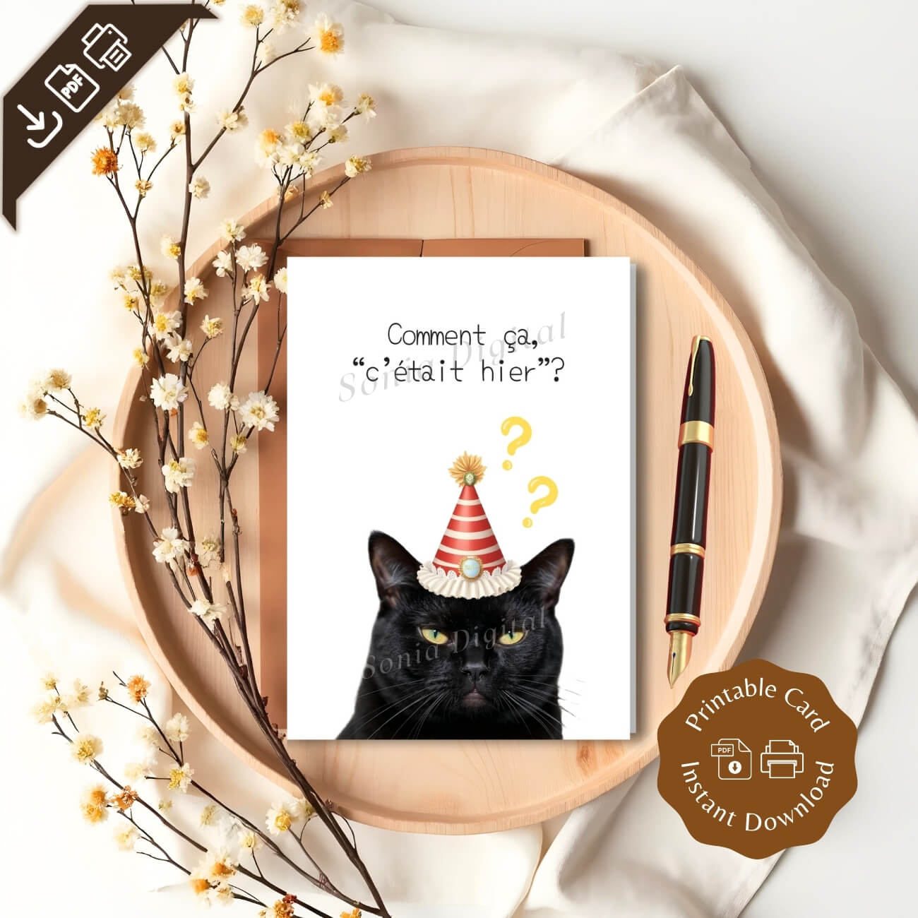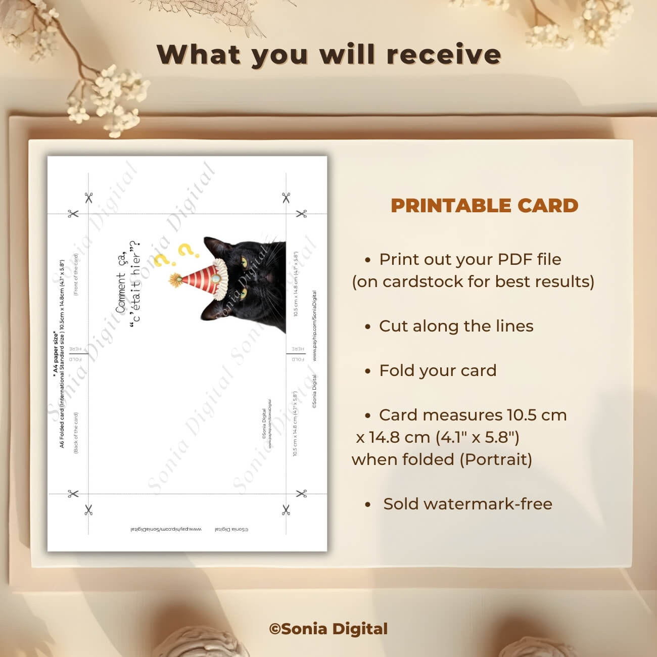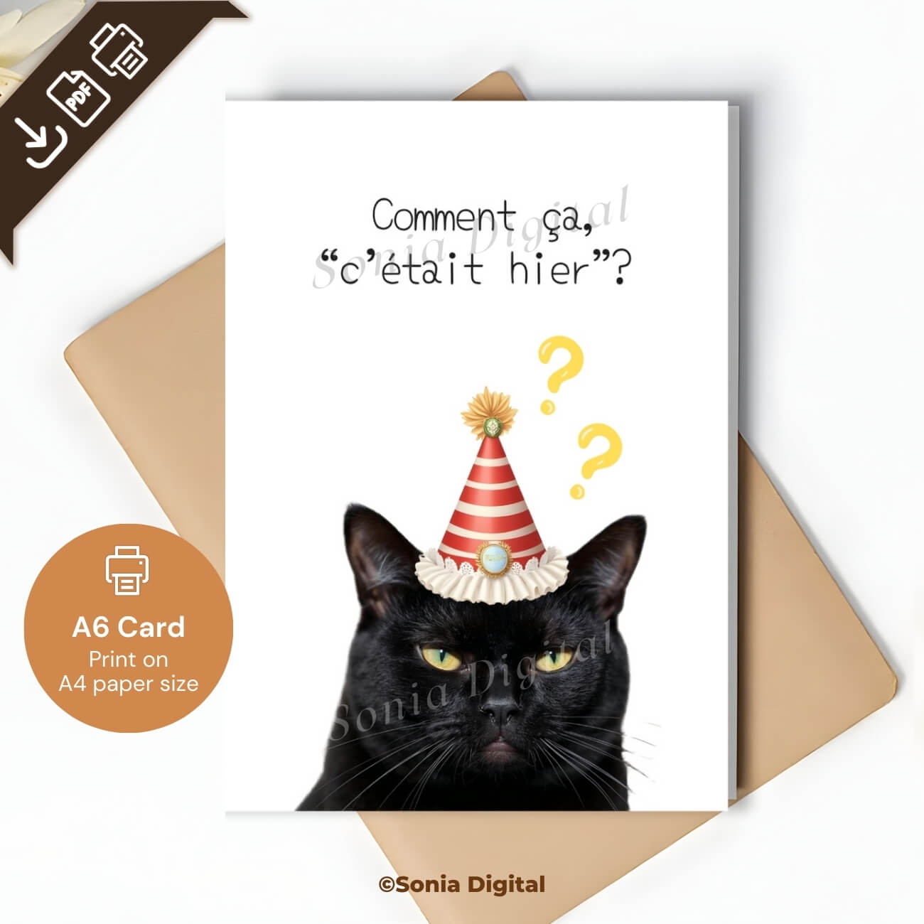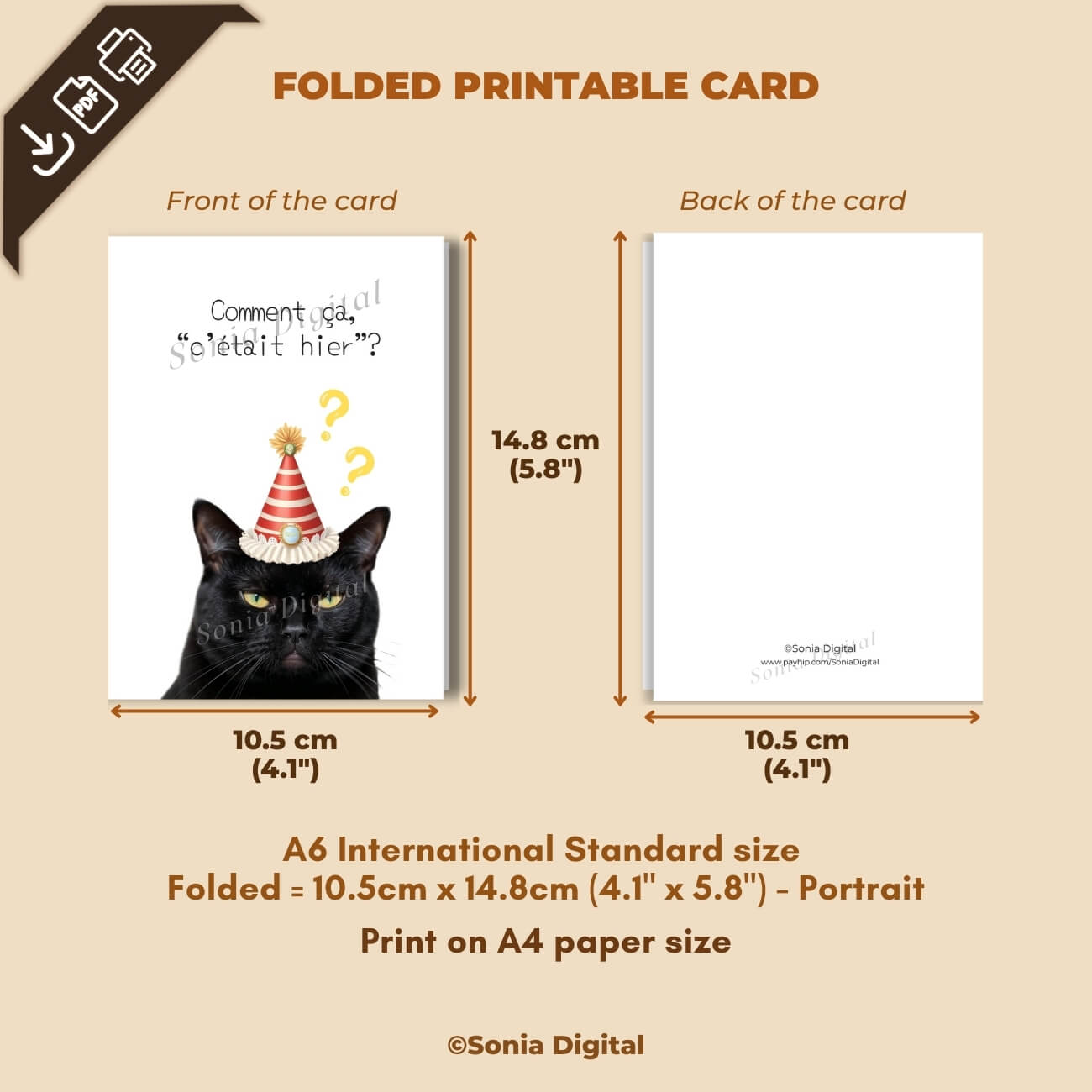 1 Printable Birthday Card “Comment ça c’était hier?” Cat, A6 International Standard size - when Folded is 10.5 cm x 14.8 cm/ 4.1" x 5.8"). Available in: