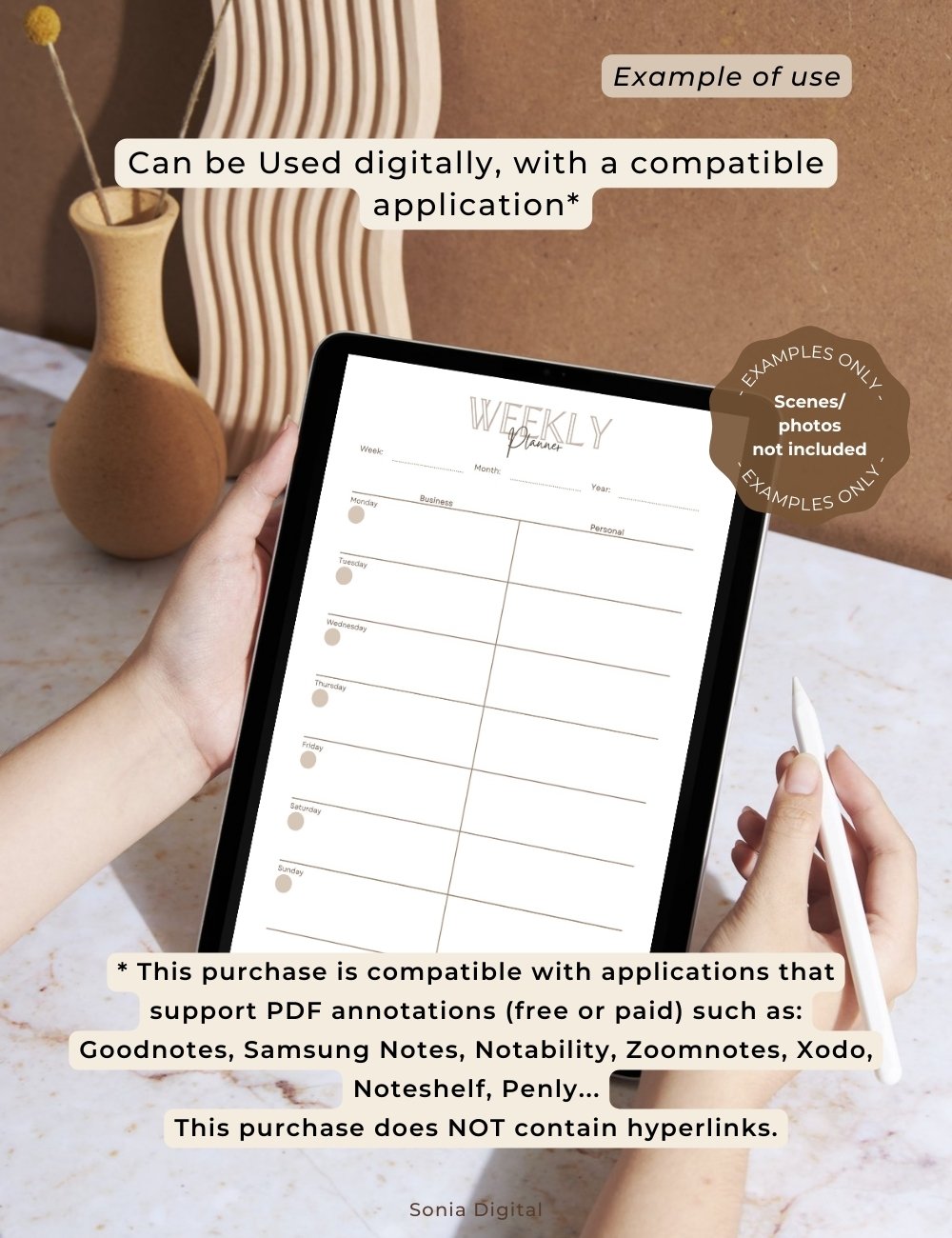 * Digital use: Compatible with note-taking and planning applications that support PDF annotation files such as: Goodnotes, Samsung Notes, Notability, Zoomnotes, Xodo, Noteshelf, Penly, etc.