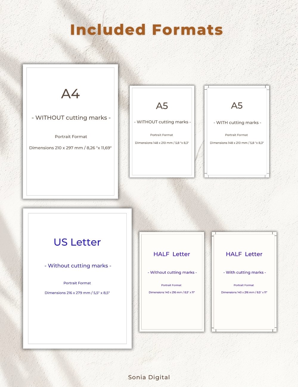 (A4 = 210 x 297 mm / 8.26’ x 11.69’ ▪️ A5 = 148 x 210 mm / 5.8’ x 8.3’ ▪️ Letter = 216 mm x 279 mm / 8.5’ x 11.0’ ▪️ Half Letter = 140 x 216 mm / 5.5’ x 8.5’)