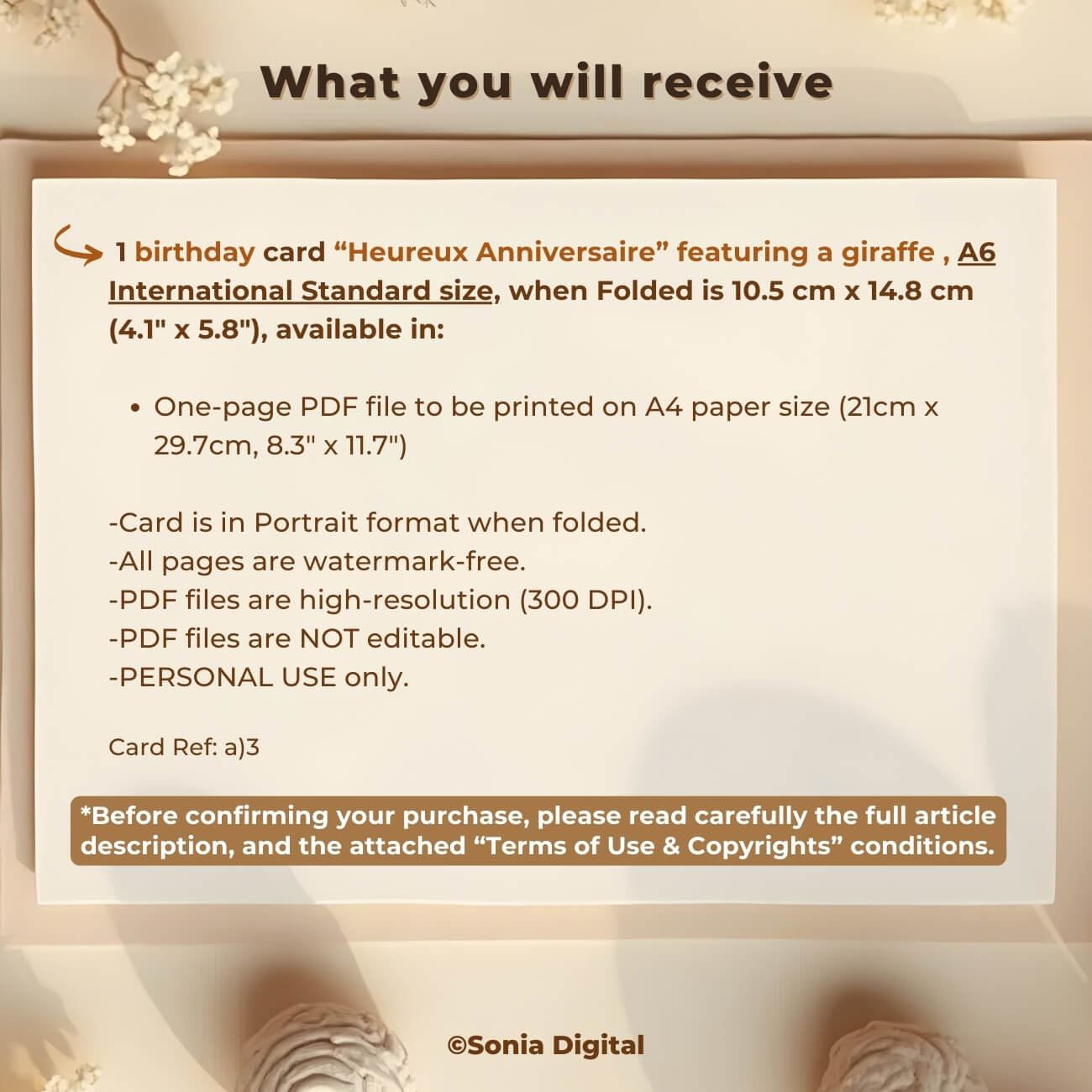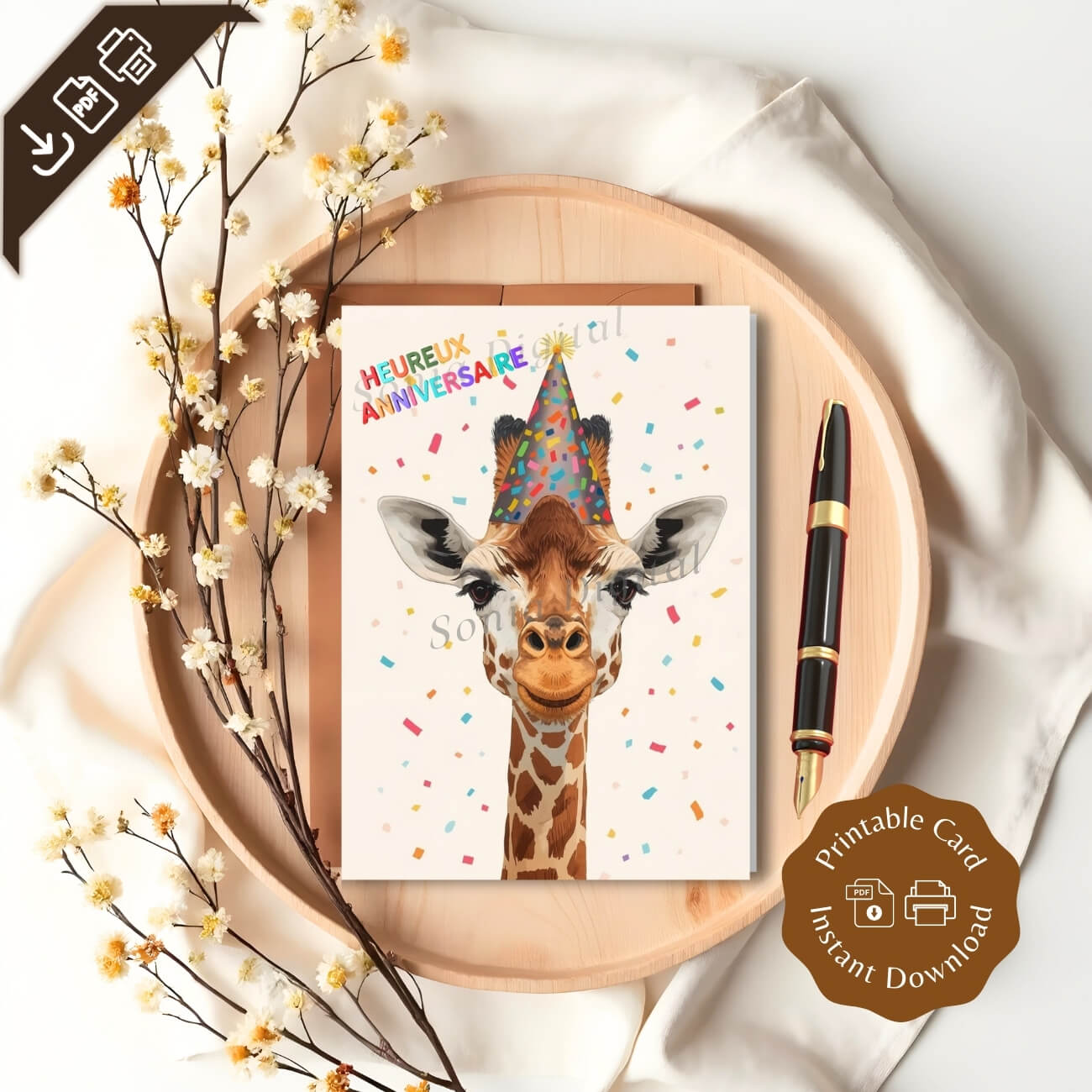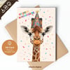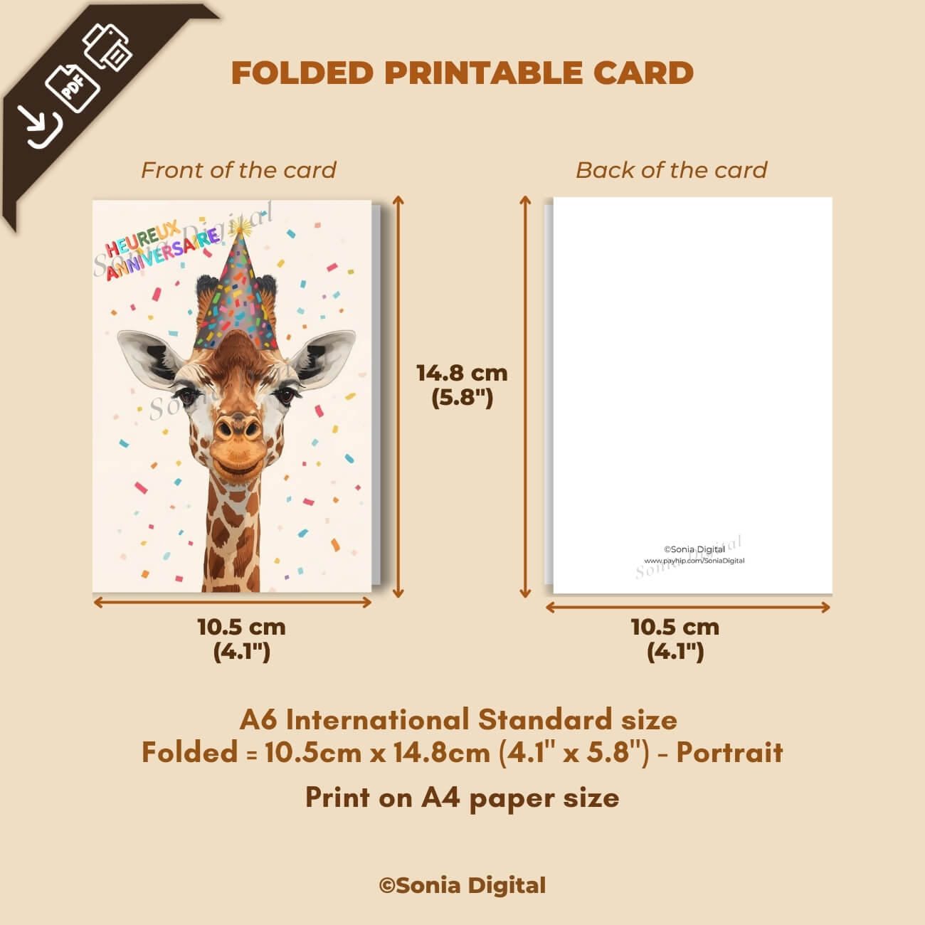 1 Printable Birthday Card “Heureux Anniversaire” Giraffe, A6 International Standard size - when Folded is 10.5 cm x 14.8 cm/ 4.1" x 5.8"). Available in: