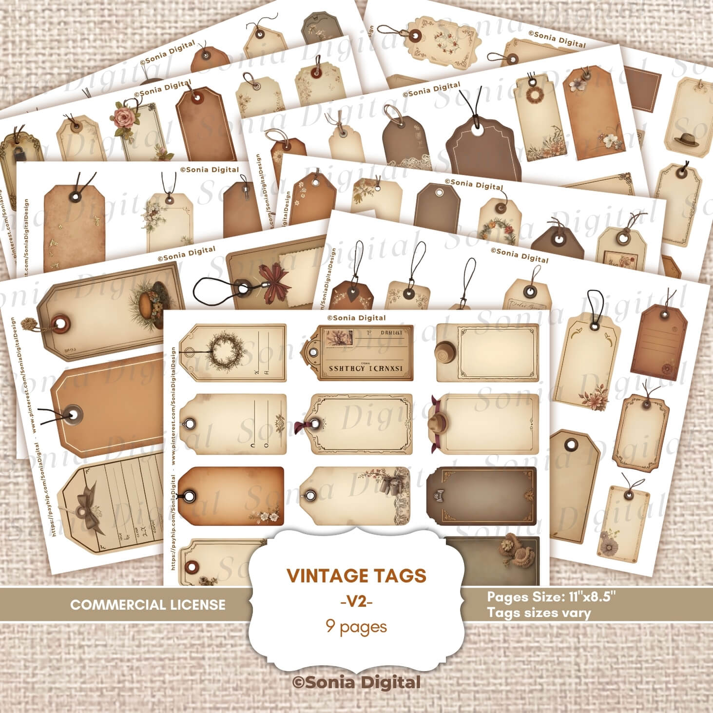 🔸9 printable pages with "Vintage Tags" Collection (Vol 2), in Letter size 11”x 8.5”. Tags sizes vary. All pages are sold without watermarks. Commercial use license included*.