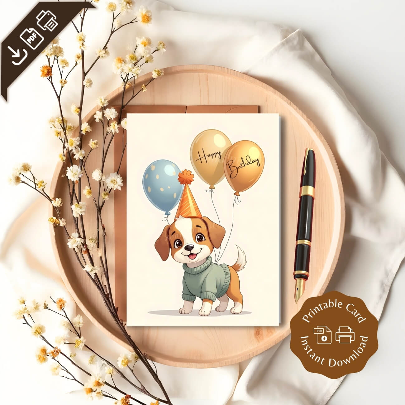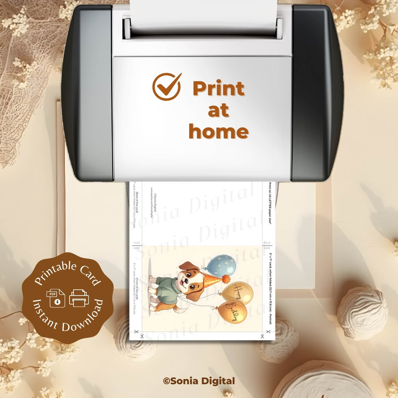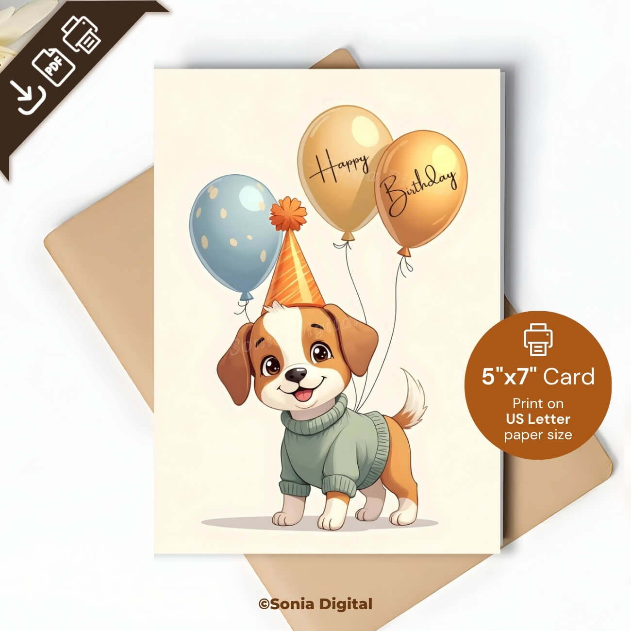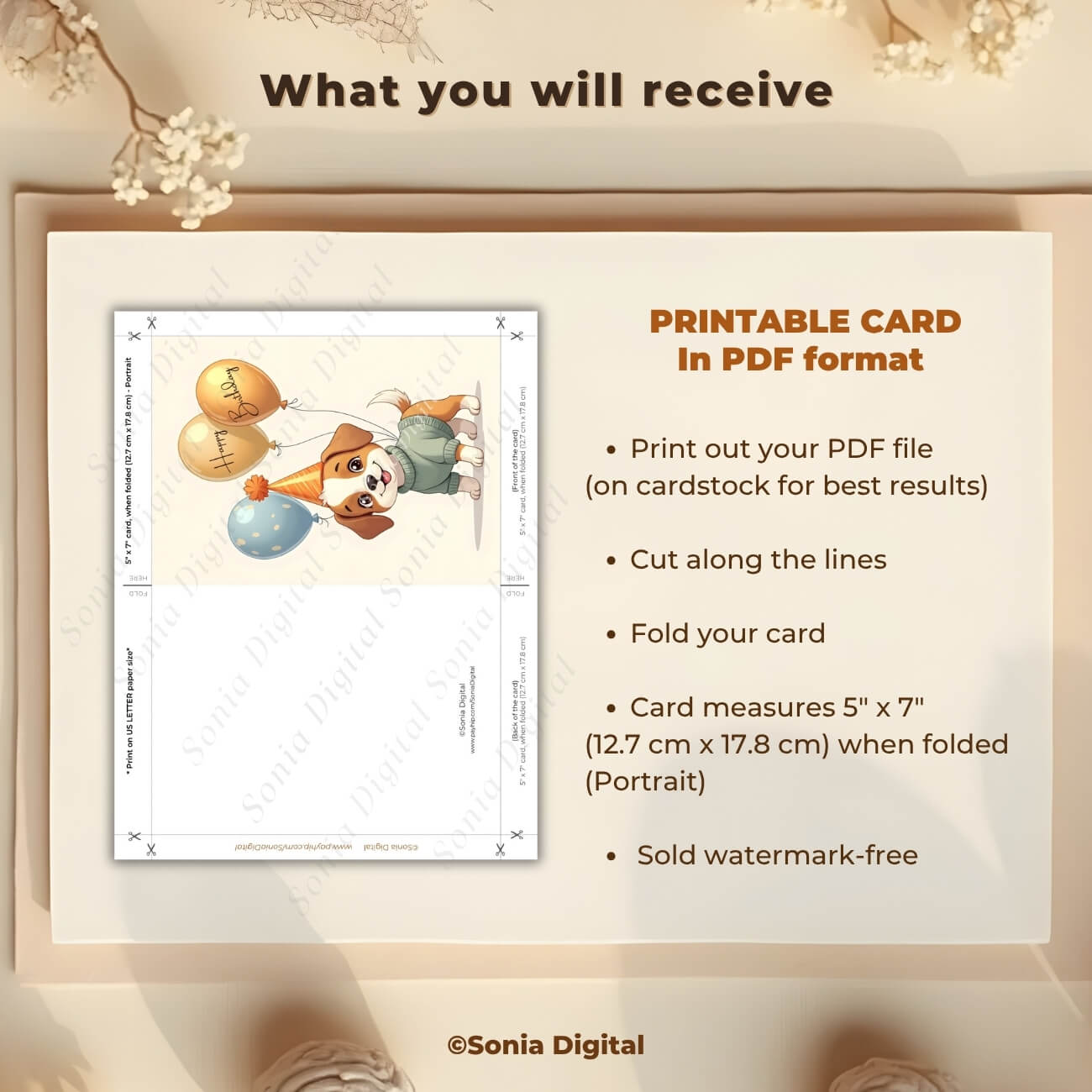 Printable Birthday Card “Happy Birthday”, 5”x7” (12.7cm x 17.8cm) when folded, featuring a puppy. Available in: