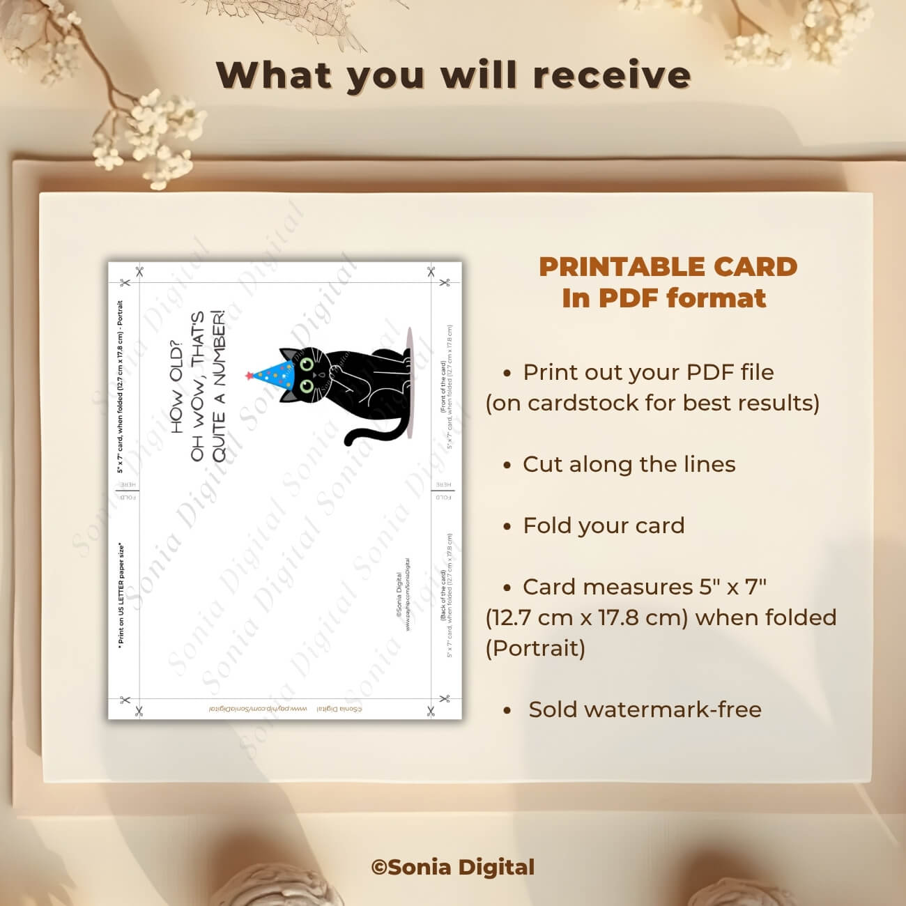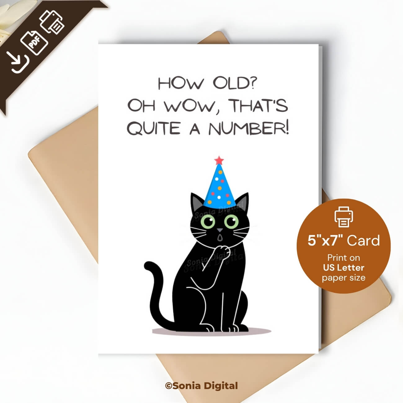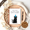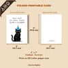 Printable Birthday Card “How old? Oh wow, that’s quite a number”, 5”x7” (12.7cm x 17.8cm) when folded, featuring a black cat. Available in: