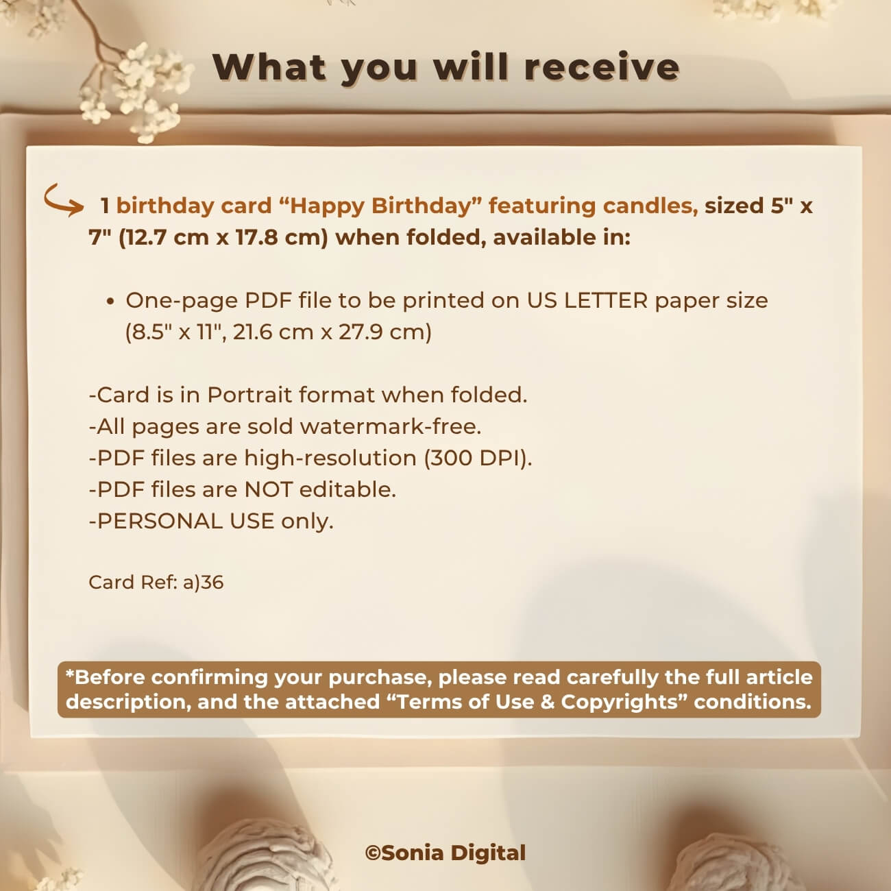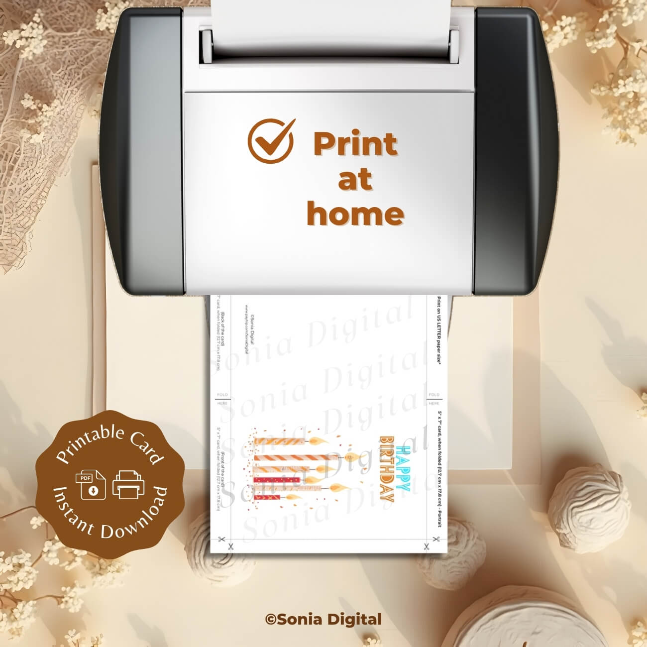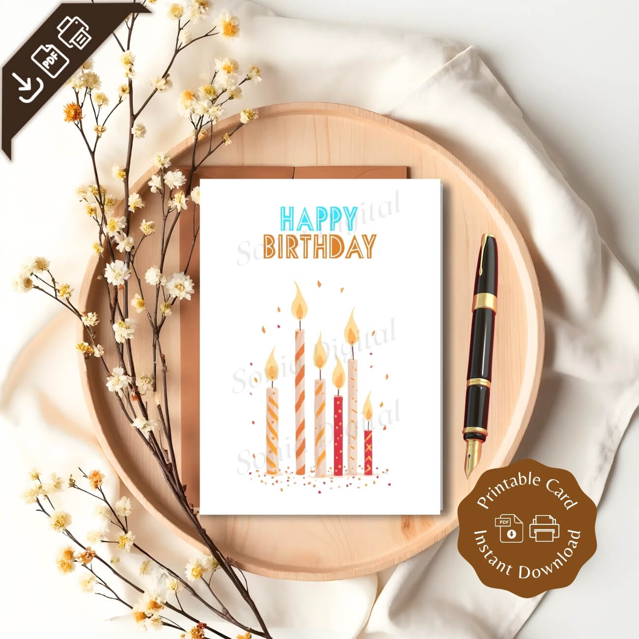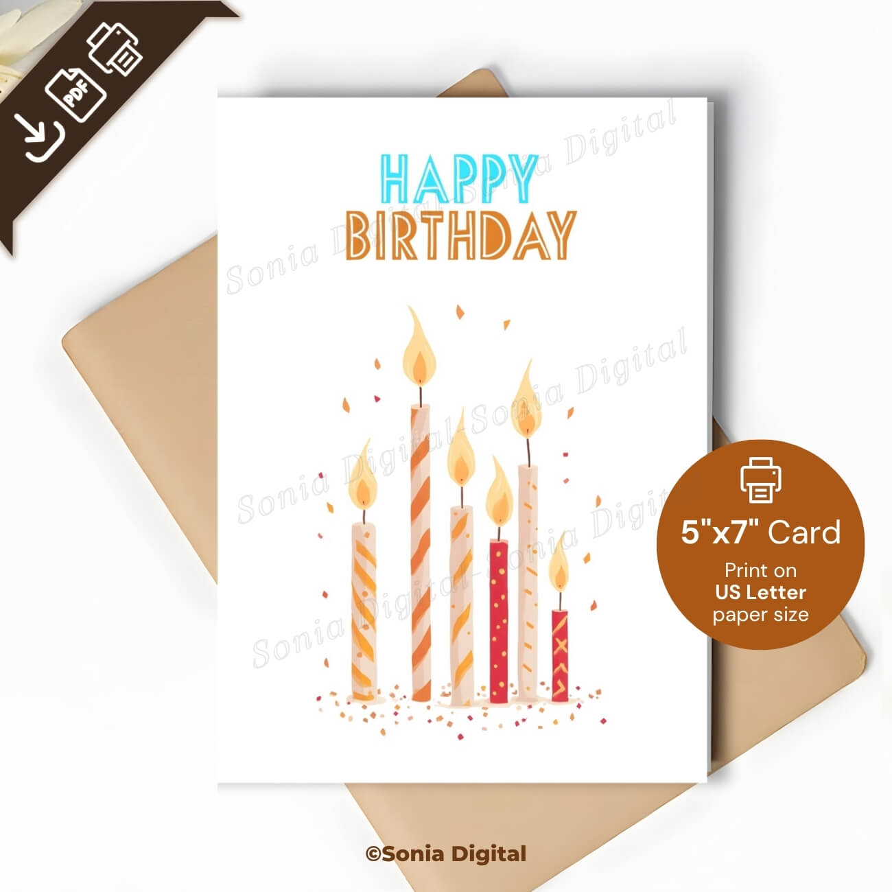 Printable Birthday Card, “Happy Birthday”, 5”x7” (12.7cm x 17.8cm) when folded, featuring candles. Available in: