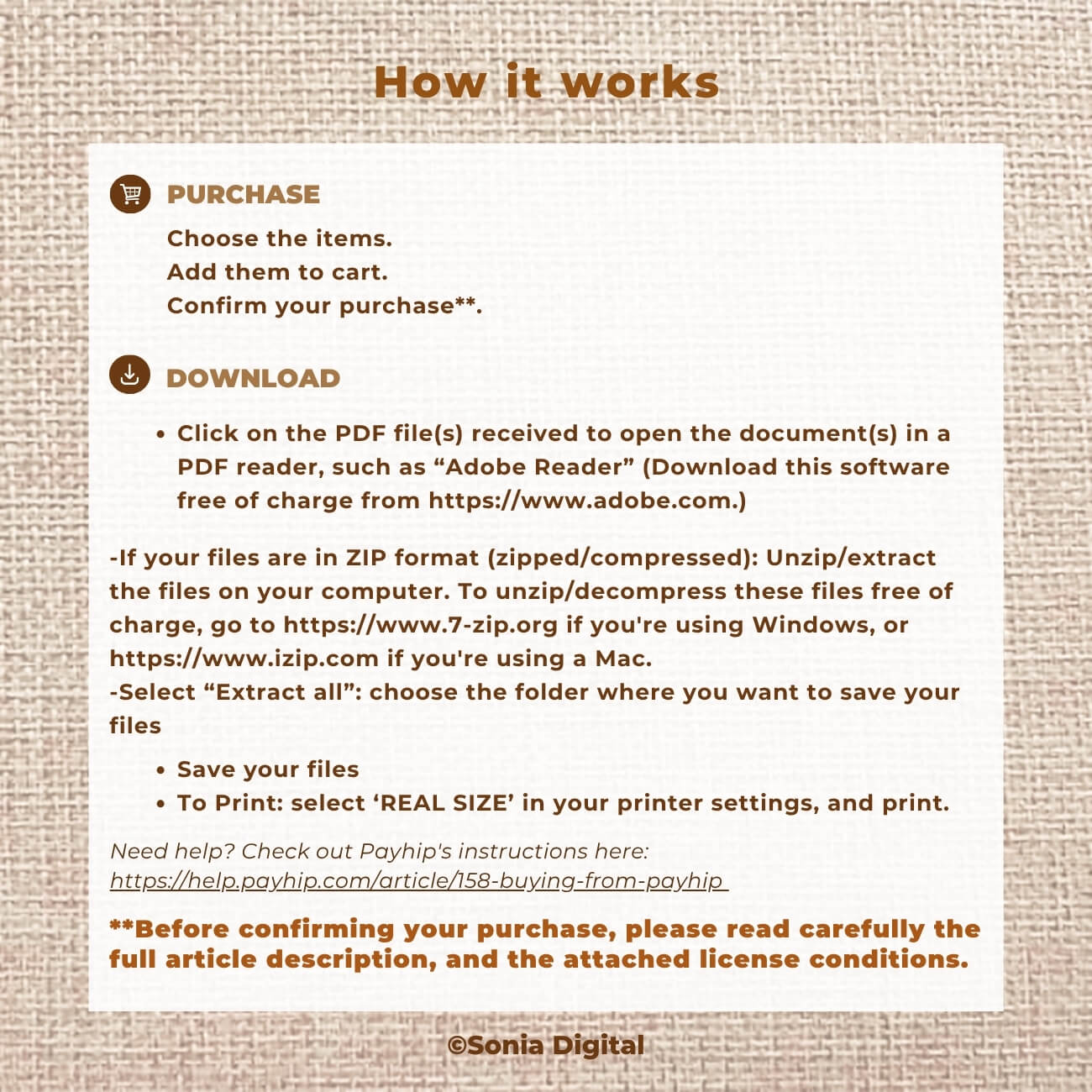 Need help with Payhip? Check out Payhip's instructions here: https://help.payhip.com/article/158-buying-from-payhip