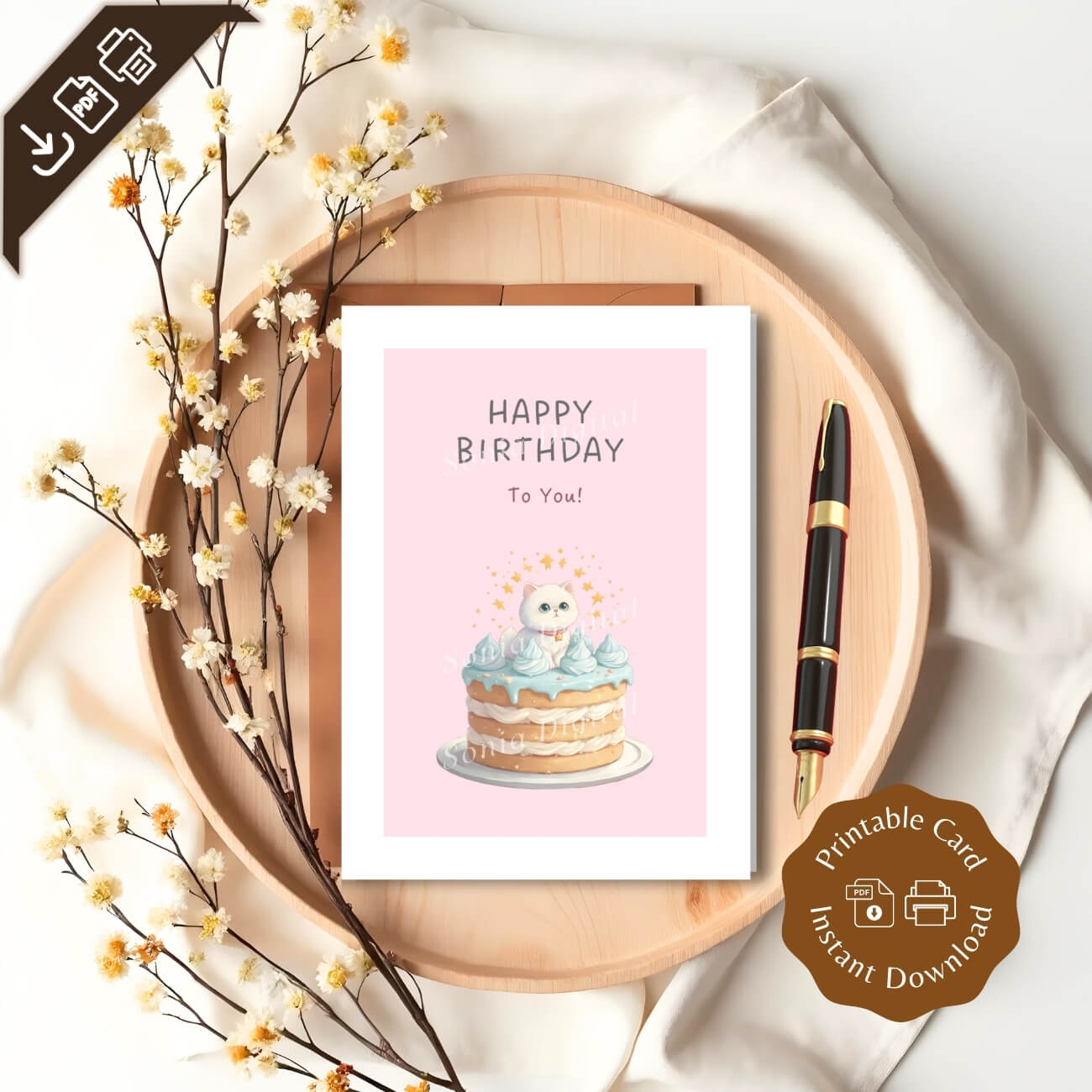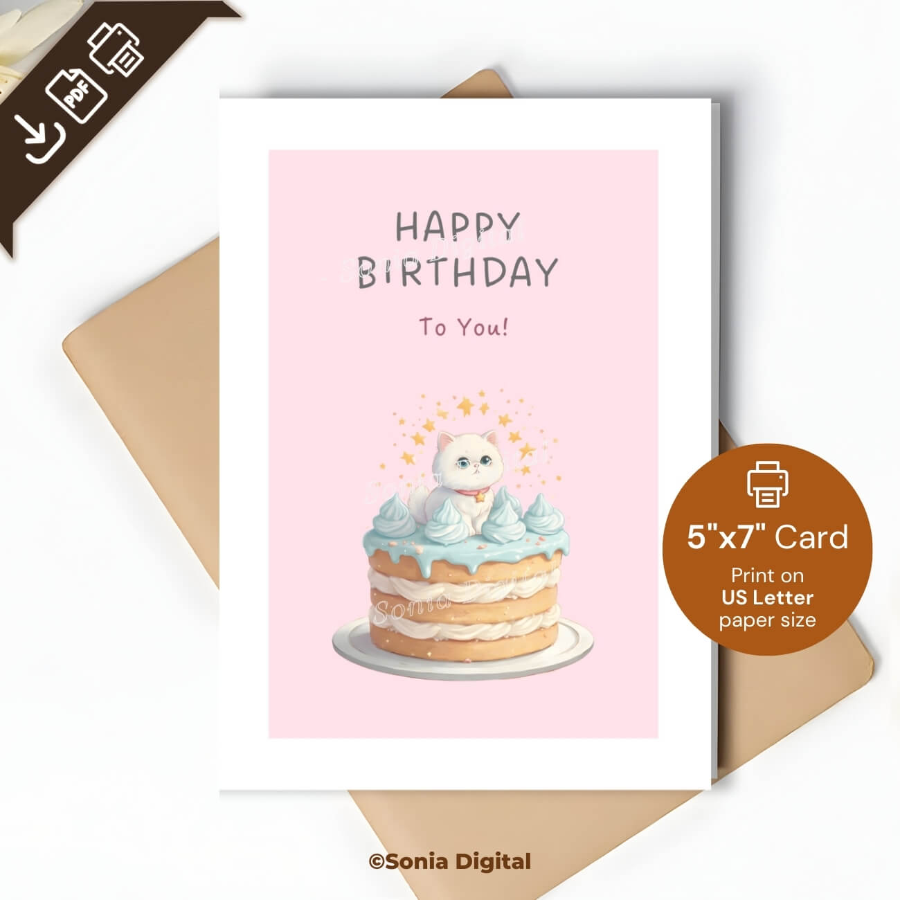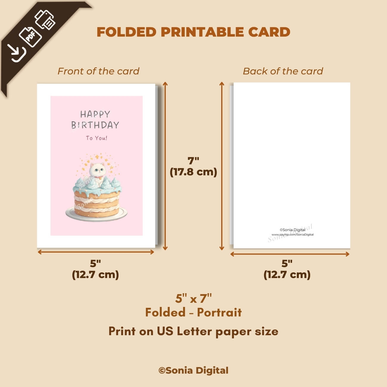 Printable Birthday Card “Happy Birthday to you”, 5”x7” (12.7cm x 17.8cm) when folded, featuring a kitten on a cake. Available in: