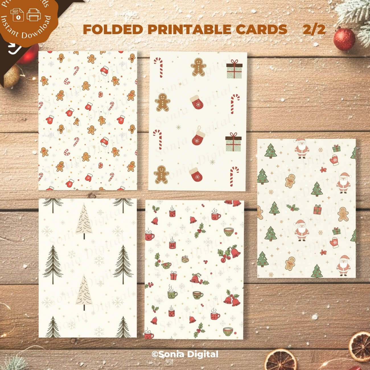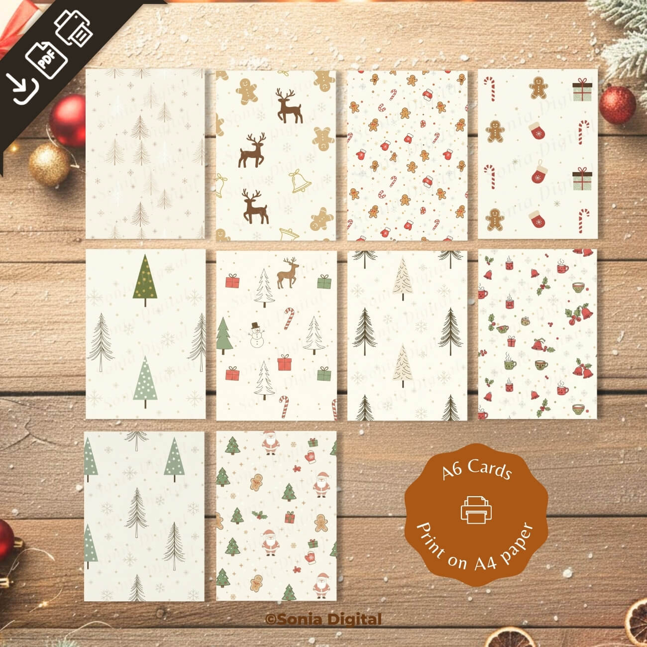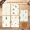 This digital set includes 10 printable Christmas card designs (No text), featuring a variety of festive patterns including gingerbread men, reindeer, Christmas trees, candy canes, Santa Claus, gift boxes, and snowflakes. Each card is sized at A6 (10.5 cm x 14.8 cm when folded) and is designed for easy printing on A4 paper.