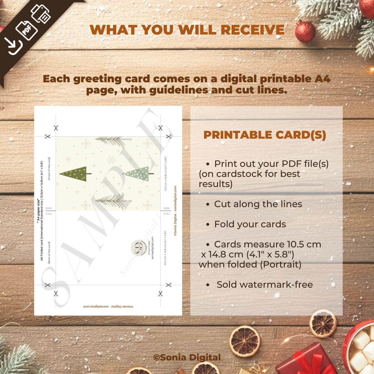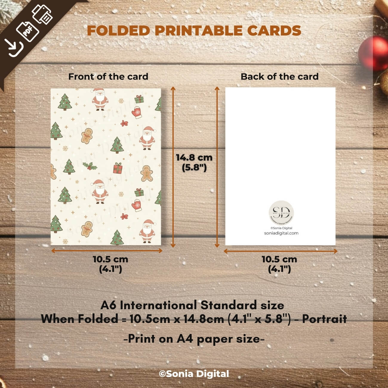 10 Printable Holiday Greeting Cards (No text), in A6 International Standard size - when folded are 10.5 cm x 14.8 cm/ 4.1" x 5.8"). Available in: