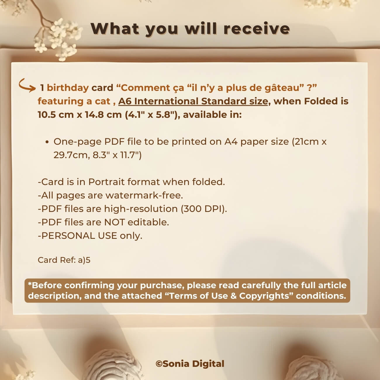 1 Printable Birthday Card “Comment ça il n’y a plus de gâteau?” Cat, A6 International Standard size - when Folded is 10.5 cm x 14.8 cm/ 4.1" x 5.8"). Available in: